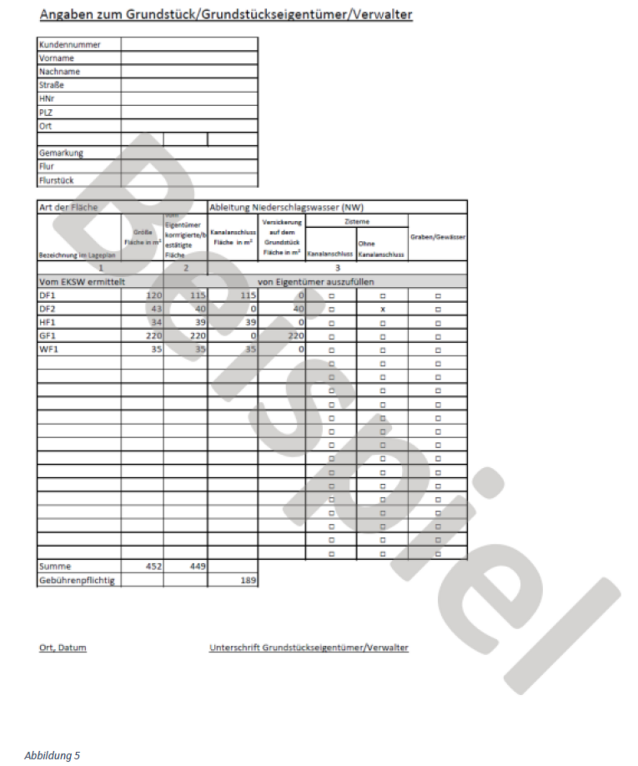 Sollten Sie uns den Erfassungsbogen nicht im genannten Zeitraum zurückschicken, müssen wir davon ausgehen, dass unsere Flächenermittlung für die Berechnung der Niederschlagswassergebühr zutrifft und eine Berechnung nach Aktenlage erfolgt.