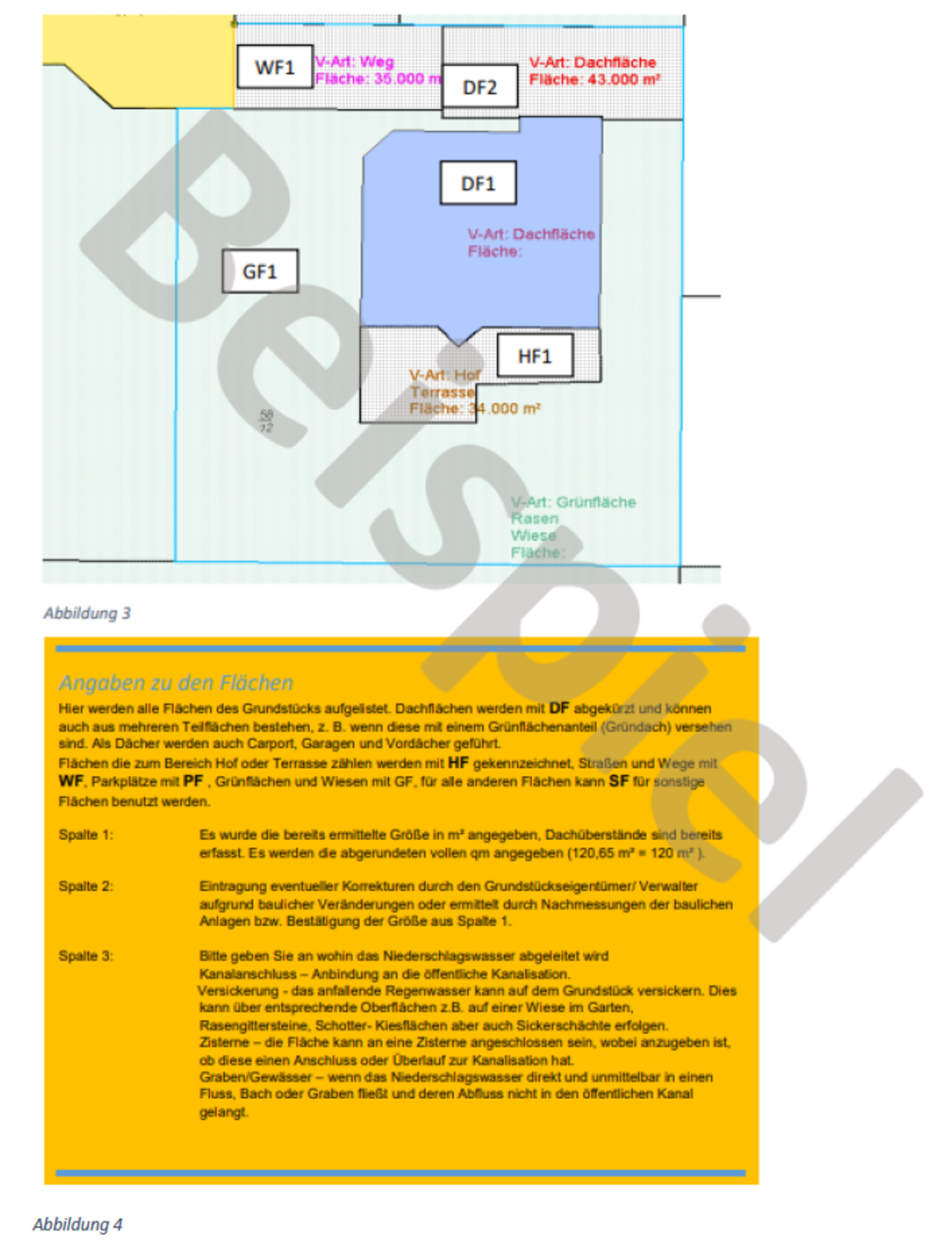 In der Abbildung 3 sind drei Flächen noch nicht zugeordnet, daher haben diese Flächen die Füllung einer unbekannten Fläche, obwohl sie die Flächenart (Weg, Dachfläche und Hof/Terrasse) ausweisen. Hier fehlen die Informationen zum Anschluss an die öffentliche Kanalisation. Bitte benutzen Sie nun den beiliegenden Erfassungsbogen (siehe Abbildung 4) und füllen diesen vollständig aus.